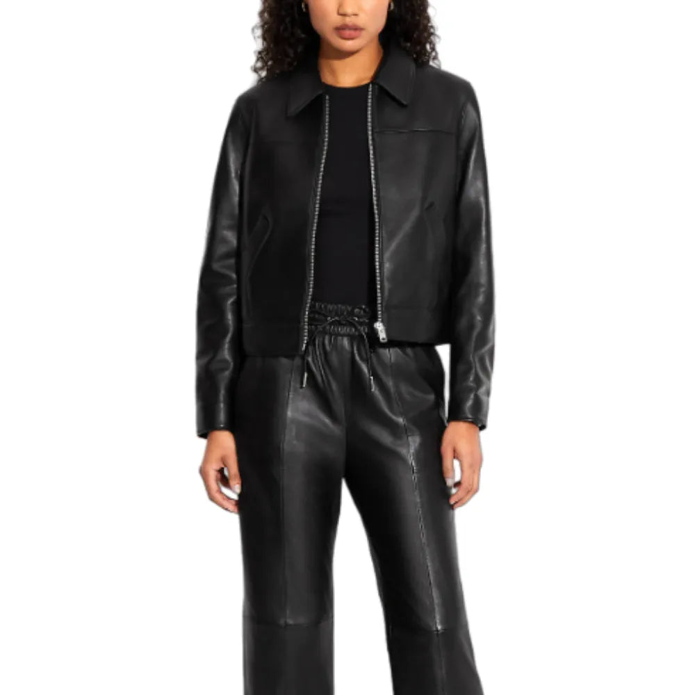 Elevate your style with our Women's Black Lambskin Leather Jacket. Crafted from exquisite lambskin leather, this black lambskin jacket women exudes sophistication and luxury. The supple texture feels incredibly soft against your skin. Designed to hit at the hip, it flatters your figure while providing a versatile silhouette. The zip closure and buttoned cuffs add modern elegance. With slip pockets and a cozy polyester lining, it offers both functionality and comfort. Whether you're heading to the office or stepping out for a night on the town, Leather Jackets For Women will be your go-to choice.