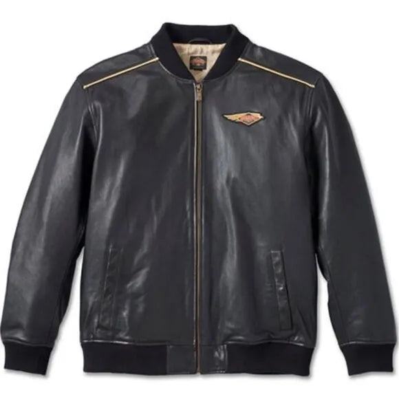This men's black leather Harley Davidson jacket is crafted from midweight goatskin leather and features 100% polyester satin lining for a soft, comfortable fit. Also, the Harley Davidson jacket black has a Zip closure and welt hand-warmer pockets with hidden snap closure. Adding more, Piped contrast detailing on the shoulders and back yoke, rib-knit collar, cuffs, and waistband, and a woven 120th Anniversary Speed Bird label for added style. Keep your items secure with an interior stash pocket.